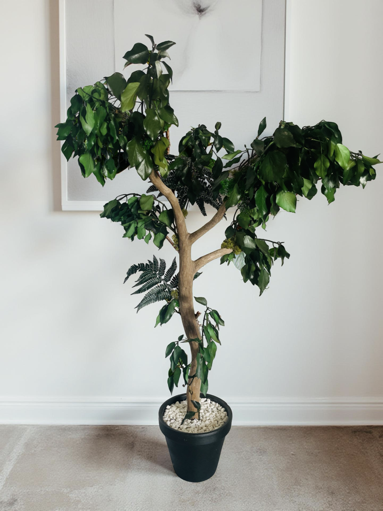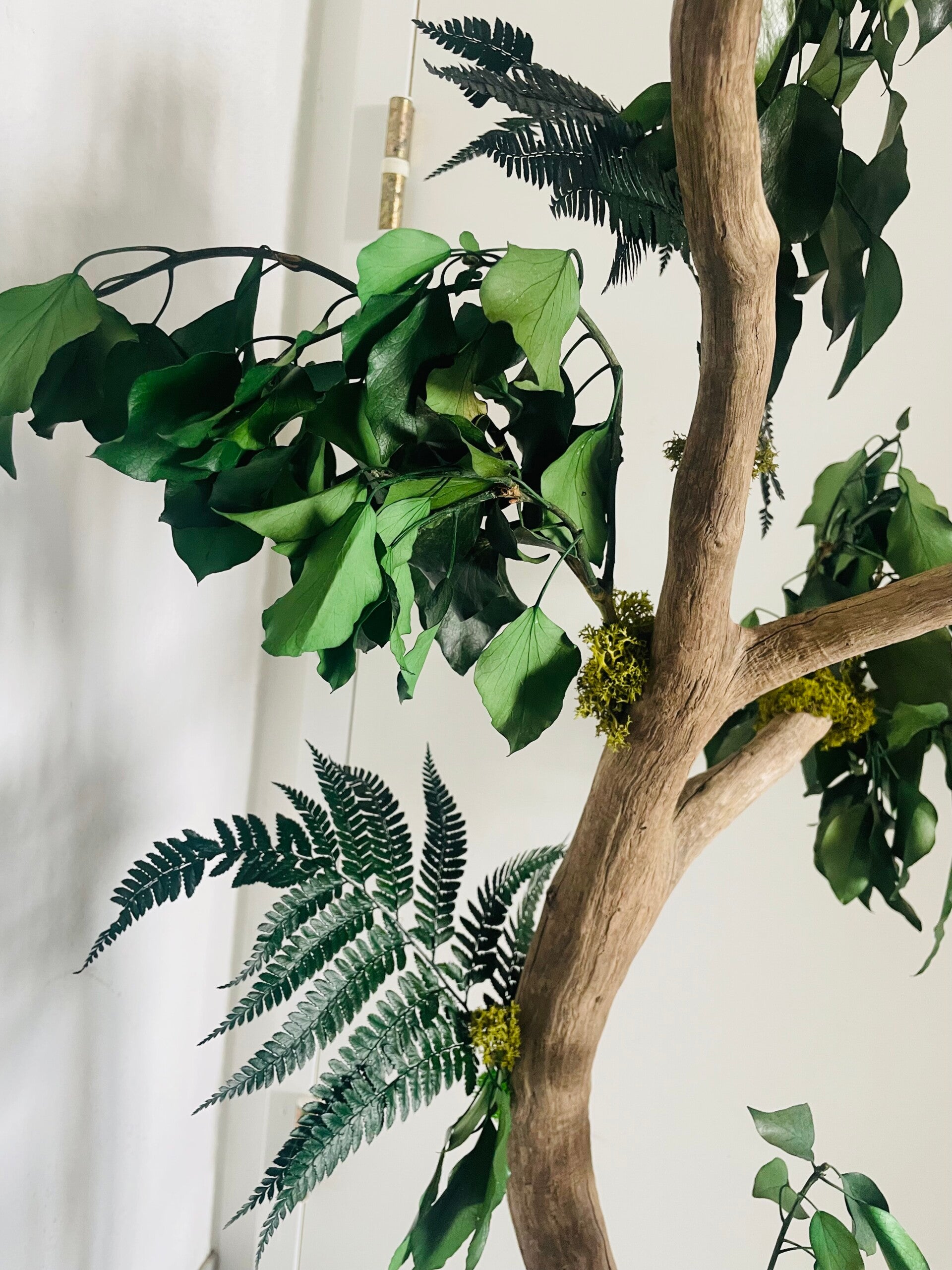 Arbre en pot avec bois flotté récolté localement composé de lierre, fougère et de lichen naturel stabilisé