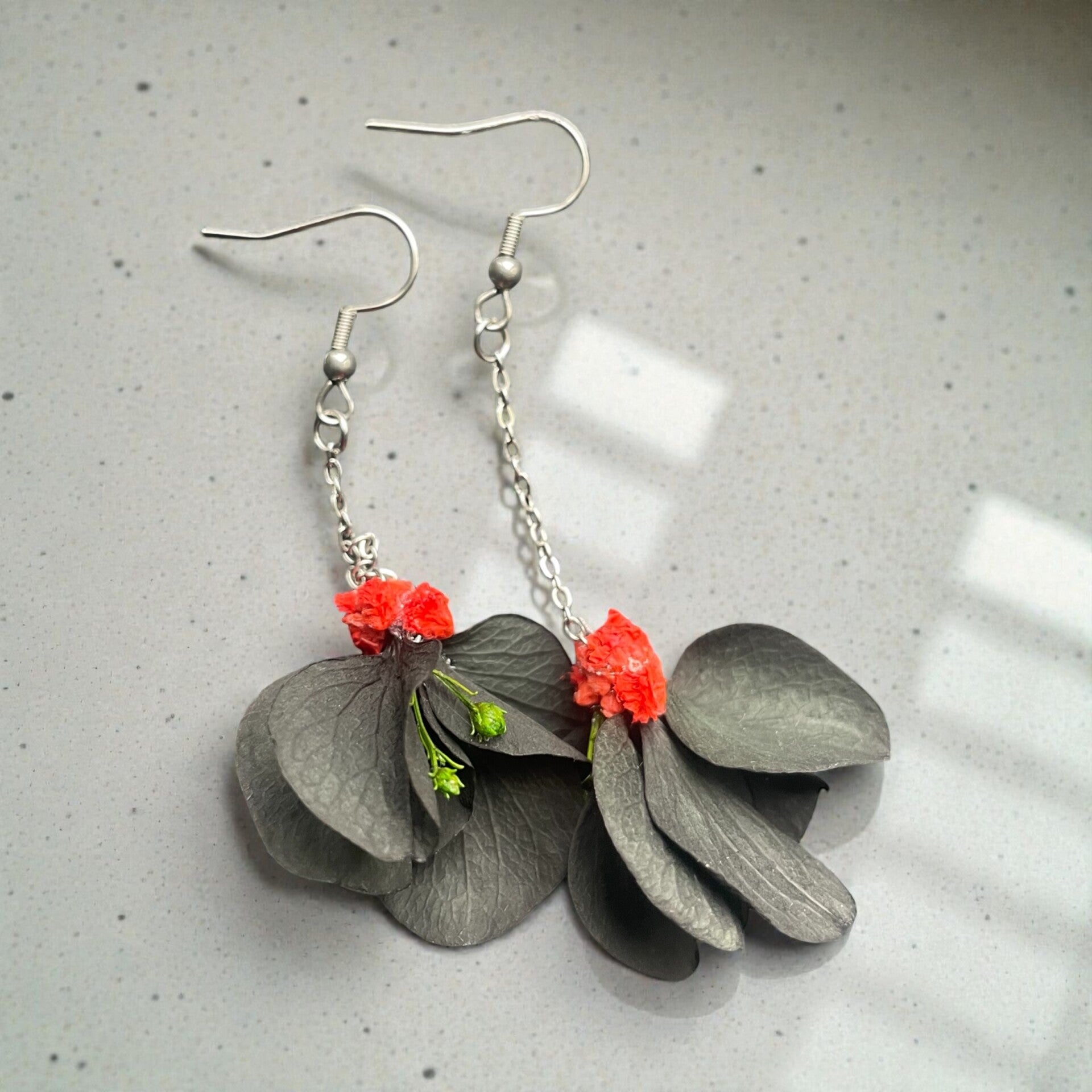 Les boucles d'oreilles pendantes Dark Lovely sont fleuries avec des fleurs noires d'hortensia, du gypsophile rouge et du broom vert