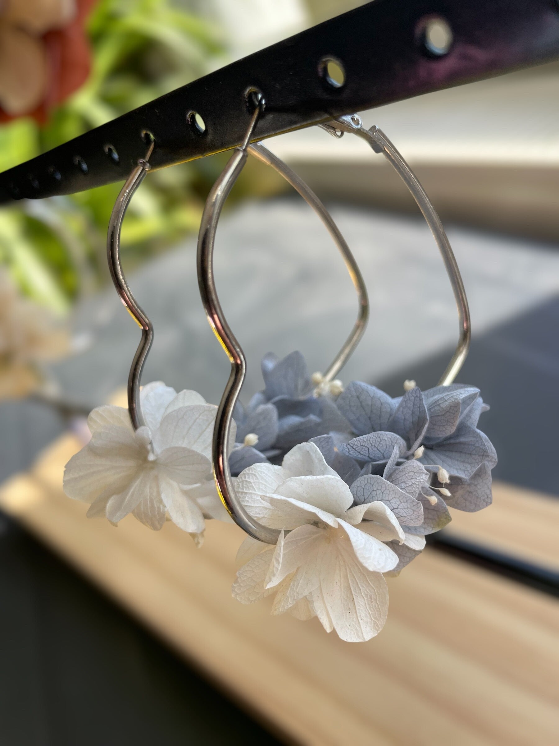 La paire de boucles d'oreilles Coeur Créole est composée de fleurs blanches et de fleurs grises d'hortensia.
